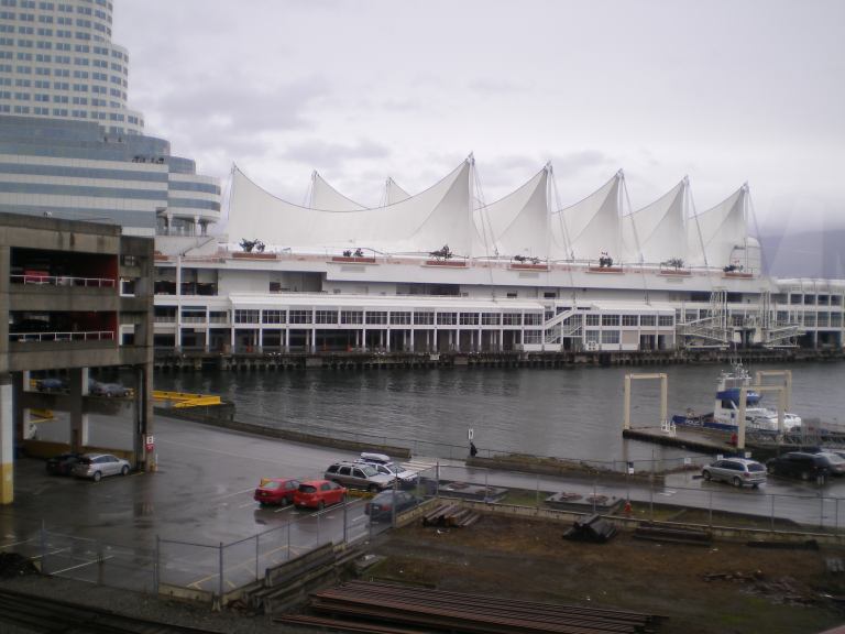 ←船の帆のように見えるのは、かの有名なカナダ・プレイス。バンクーバーのツアーの広告などでよく見られる。この写真はウォーターフロント駅(ターミナル駅)から撮った。船の帆のような建物は、1986年のバンクーバー万博でカナダ館として使われたとか。