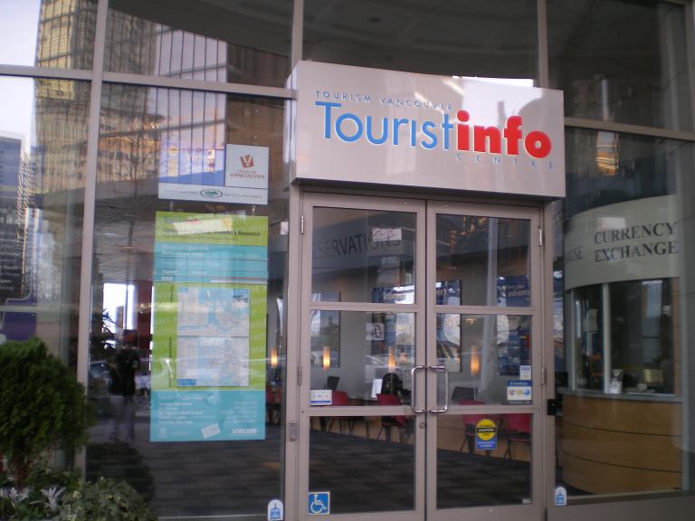 ←Torist Infoの入り口。タダで地図、バスルートマップ、カラフルなガイドブックを入手しよう。日本語資料あり。近隣の観光地(ビクトリア、ウィスラーなど)のガイドブックも手に入る。