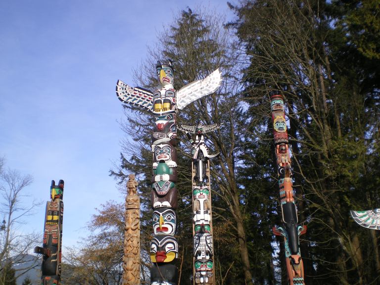 かの有名な、スタンレーパークのトーテム・ポール。きれいに彩色されている。写真中央のてっぺんにある鳥は、なんともいえぬ面白い顔をしていた。