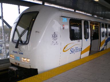 スカイトレインはトランスリンク社が運営する、バンクーバー市と近郊を結ぶ交通手段のひとつで、早くて快適、ほとんど揺れない、5分おきくらいに来る、と非常に便利である。朝夕の混雑時には15秒おきくらいに来る。いくらコンピュータ制御の無人運転だからって、先に出た車両のおしりがまだ見えているときに次の車両が入港(入プラットフォーム?)するのってスゴイ・・・・。