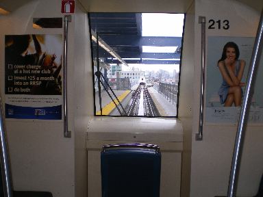 ←これがウワサのスカイトレイン。車体は小さめ。体格の大きなカナディアンが乗ると、天井に頭がついたりしそう。日本人をはじめとしたアジア系の市民ならともかく、カナディアンが乗っていると非常に窮屈そうに見えてしまう。