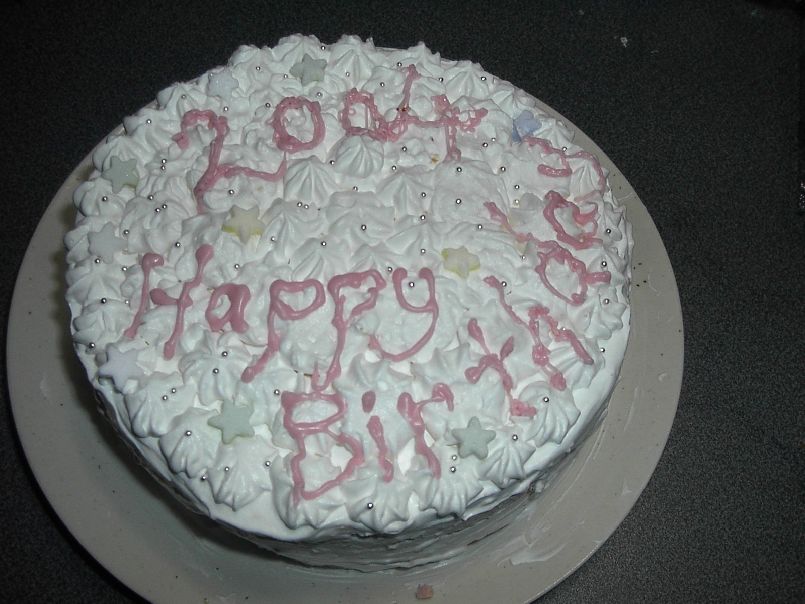 生クリームでデコレーションした上、ピンクのチョコペンで 2004 Happy Birthday と書いてあります。