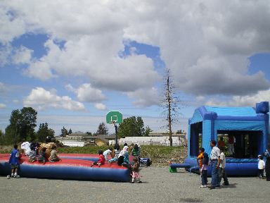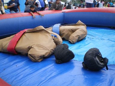これは、興行っぽいアトラクションの一つだったようで、まず幼児用プールの要領で空気を入れたリングを用意する。扇風機の親玉みたいな機械を使って、轟音をたてながら常に空気を入れ続ける必要がある。リングの周囲で、トランポリンのように子供たちが乗っかって跳ね回るので。進行役兼審判の若いお兄ちゃんが、希望者の中から試合出場者を2名選んで、着ぐるみを着せる。子供たちは着ぐるみを着ると満足に動くことすらできないので、よろけながら相手に体当たりして、先に地に着いたほうが負けのようである。暇だったので、韓国人の友人と一緒にしばらく見ていたが、かなり笑える。
