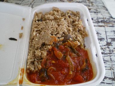 食事の出店もあった。写真は、変わりゴハンと、野菜や豆のトマト煮込みのようなもの。何という種類のコメなのか分からなかったがとにかくおいしい。多分ブラウンライス(玄米)とブラックライスとジャスミンライスが混ざったような感じだと思う。カナダに来て初めてブラックライスなるものを知ったが、プチプチッとした固めの歯ざわりが楽しくて、おいしい。ホームステイでも時々出たなぁ。
