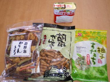 このとき買ったのは、カラフルなお好みかりんとう、香ばしい胡麻かりんとう、柚子&すだちキャンディ(こんなの日本でも見たことない)、それにサクマドロップスである。