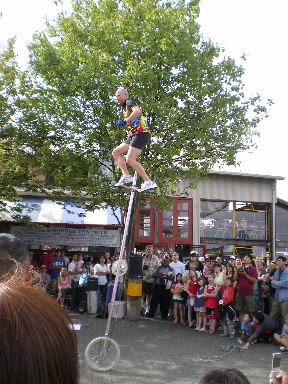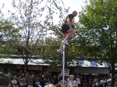 おっ、念願の(?)大道芸人発見。おじさんが長ーい一輪車に乗っている。これに乗るために周囲の観客を巻き込んで手伝わせたり、笑いを取ったり、降りるときに観客をハラハラさせつつ笑わせたり。乗るのを手伝った観客らの腕時計をいつのまにか持ってるなど、手品のようなことも。「これを返してほしくば、降りるのも手伝って~」という流れに持っていくのだ。
