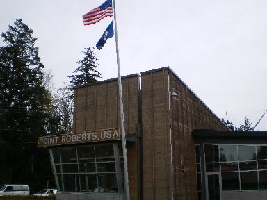 これがポイント・ロバーツの国境審査の建物。はためくアメリカンフラッグ。星条旗よ永遠なれ。