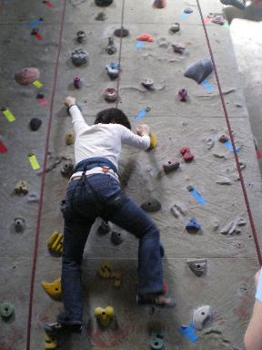 D君は、普通のクライミングのみならず、縄梯子を登るコースにも挑戦していた。縄梯子は天井からただ下がっているだけのもので、壁についていないので、非常に難しいコースらしい。さすがスポーツマンD君、かなりいい線まで登っていた。