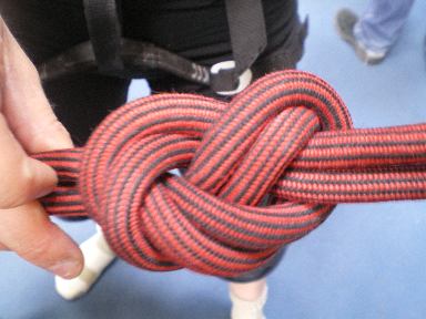 ←これが、安全な命綱の結び方。必ず8の字になるようにする。これを怠ると、落下してケガをするかもしれない。