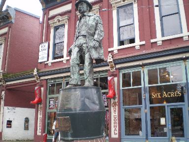 バンクーバー発祥の地ギャスタウン。名前の由来は1867年、お酒好きのジョン・デイトは妻と犬と樽のウイスキーを片手にこの地に上陸。ここで、近くの製材所で働く労働者を相手に酒場をひらき、バンクーバーの歴史がひらかれた。彼はとても弁舌に優れ、おしゃべり好きだったため、Gassy“おしゃべり” ジャックと呼ばれ街の人気者になり、この町は次第にGassy's Townと呼ばれ、後にGastownになった。