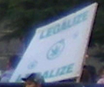 おわかりだろうか。「LEGALIZE(合法化する)」という文字と一緒に、マリファナの葉のマークが見える。そう、これは、マリファナを合法化せよ、というデモの一種だったのだ。
