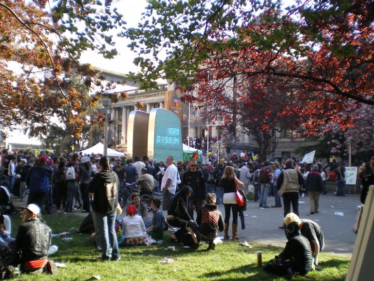 この集会の目的は、これでもう間違いない。ところで、なんだろうこの変な匂いは。雑草をすり潰して煮詰めたような青臭い匂い・・・。もしやこれが噂に聞くマリファナの匂いってやつか!以前誰かのブログで「バンクーバーを歩いていると、誰でも一度はマリファナの匂いをかぐでしょう。」と書いてあった。それを読んだ私は、「マリファナの匂いを知らなければ、たとえ匂いをかいだとしても認識できないんじゃないの?」と思っていた。しかし、たとえマリファナを吸ったことがなくても、あの異常な匂いは識別可能だった。後日、ダウンタウンのグランビルストリート沿いのコーヒーショップにいたときも、同じ匂いがして、そのとき友達が「これはマリファナの匂いだ」と教えてくれたので間違いない。(ちなみにその友達も、もちろん吸ったことはなくて、知り合いが吸っているときに一緒にいたことがあるそうだ。)